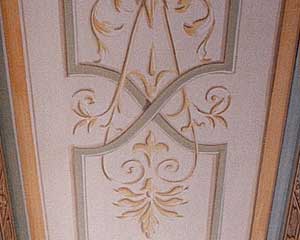 Decorazione pareti con finta tapezzeria damascato con effetto cangiante.